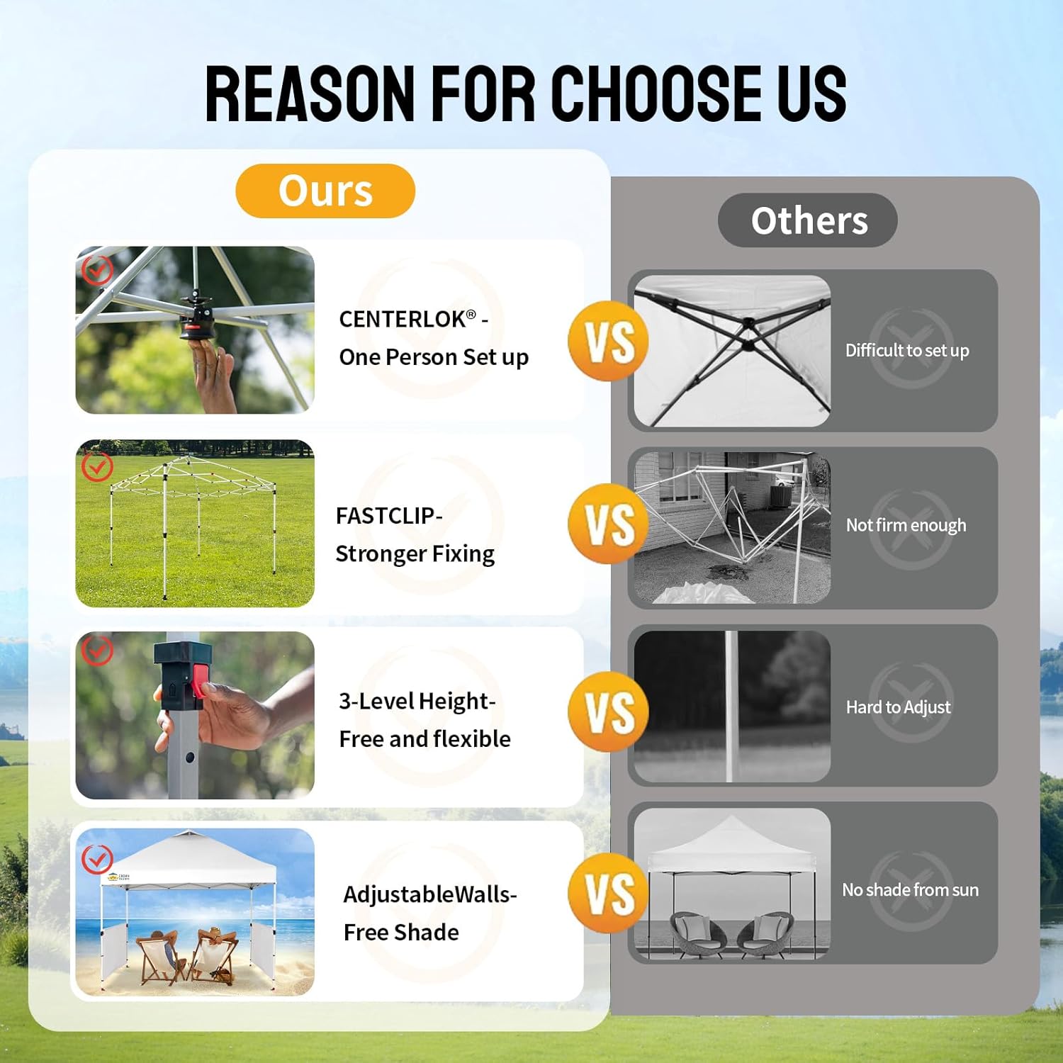 - [LARGE SPACE]: 10' x 10' canopy footprint with 100 square feet of shade. Over 9'4'' maximum interior height, and over 6' maximum clearance under the valance. The pop up canopy has plenty of standing room, and 10 people can sit comfortably in the cool shade.