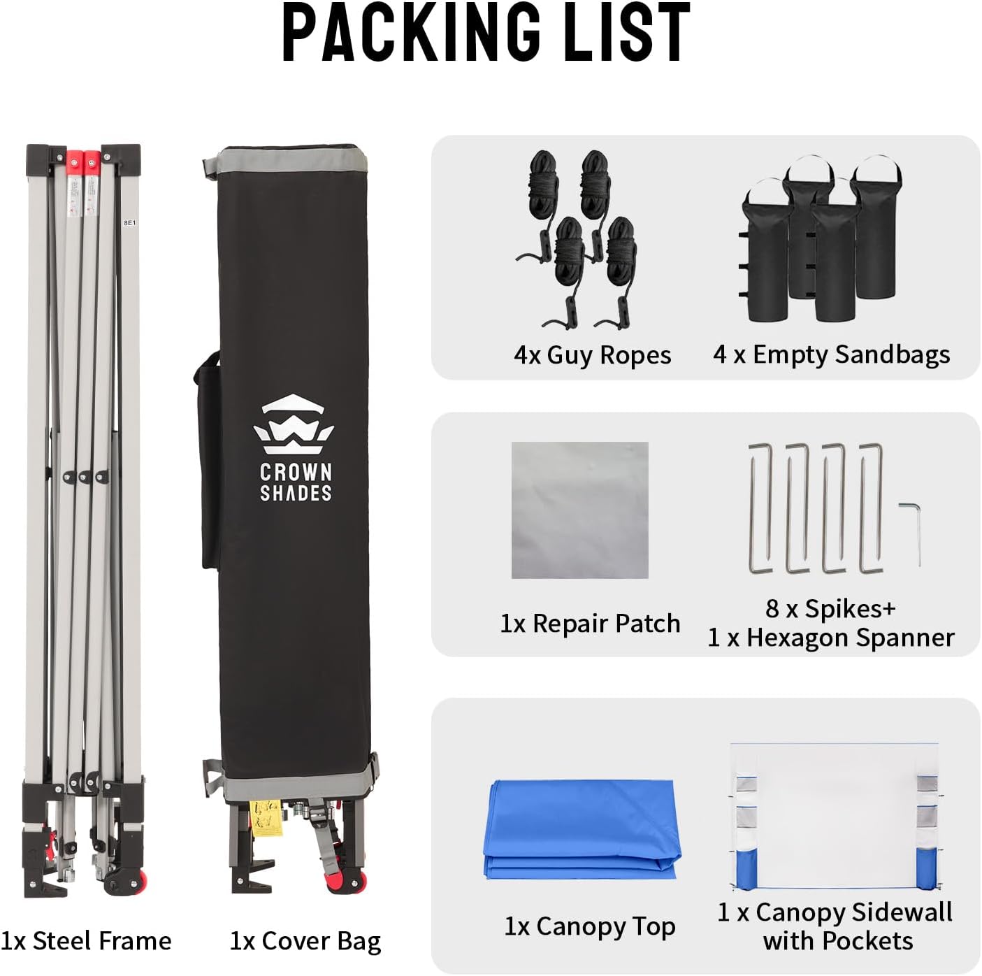 - FAST CLIP CANOPY FABRIC - The new clip system easily attaches the canopy fabric to the frame. The silver-coated interior provides UPF 50+ UV protection, ensuring cooler and safer shade. Made from rugged 150D fabric, the canopy is water-resistant and flame-resistant (CPAI-84). Integrated air vents and the EZ clip system prevent wind lift and rain pooling, reducing fabric tearing risks. A 150D sidewall with organizer pockets is included to block sunlight from the side, ideal for outdoor events.