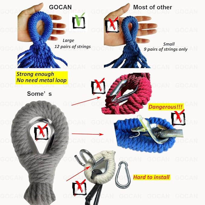 - 【3】Holds Up To 500 Lbs: The handcrafted knots at both ends and solid fabric are strong enough to holds up to 500 lbs. It is safe for couples, children and pets to relax or take a nap, the metal ring inside each end offers extra durability for long time using.