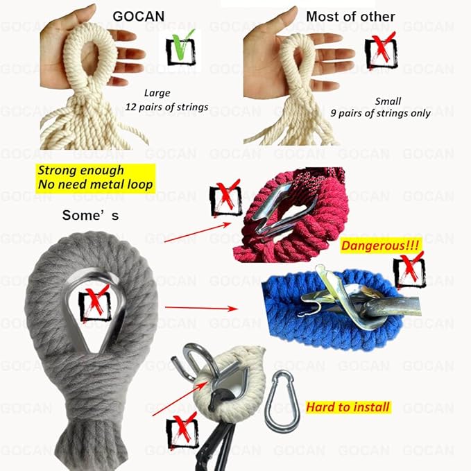 - 【3】Holds Up To 500 Lbs: The handcrafted knots at both ends and solid fabric are strong enough to holds up to 500 lbs. It is safe for couples, children and pets to relax or take a nap, the metal ring inside each end offers extra durability for long time using.