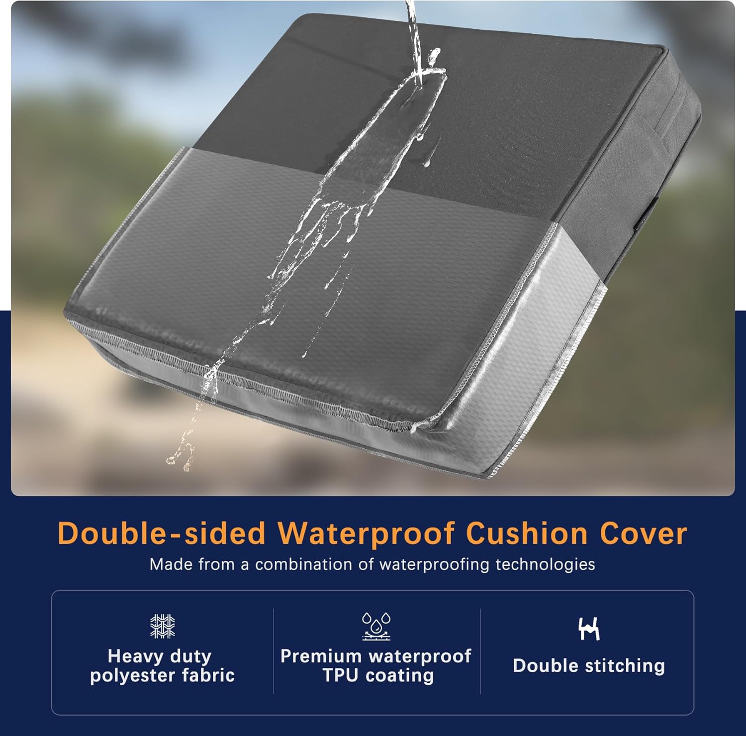 - Double-Waterproof Tech Cushion Cover: Favoyard outdoor cushions for patio furniture choose 300GSM high density polyester fabric for the cover could provide excellent waterproof and dust resistance ability. In addition, there is a TPU coating on the reverse side of the fabric. Both the TPU coating and the fabric are highly waterproof.