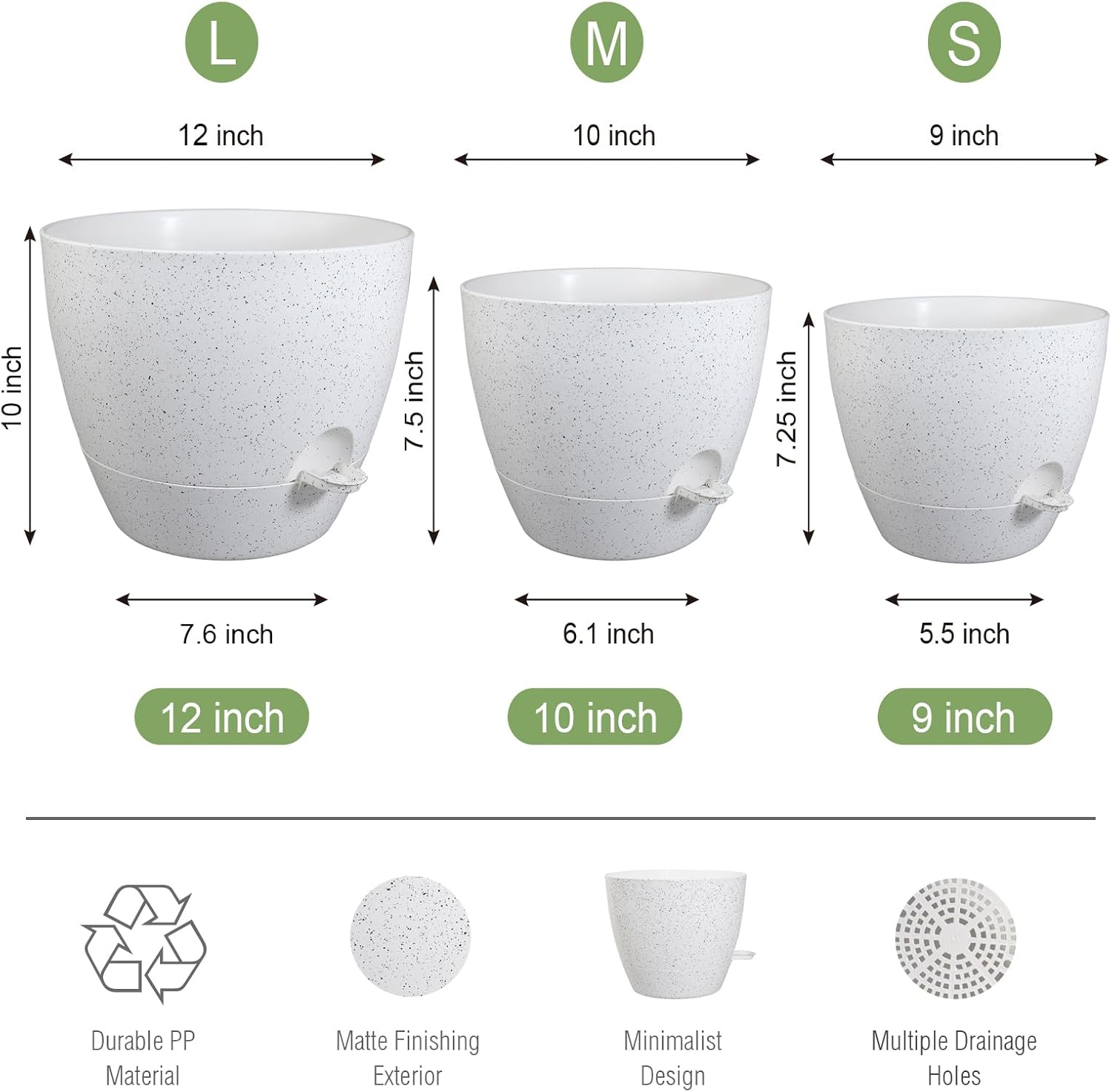 Large Self Watering Pots, 12/10/9 Plastic Planters with High Drainage Holes and Deep Reservoir for Indoor Outdoor Garden Plants and Flowers, White Speckles