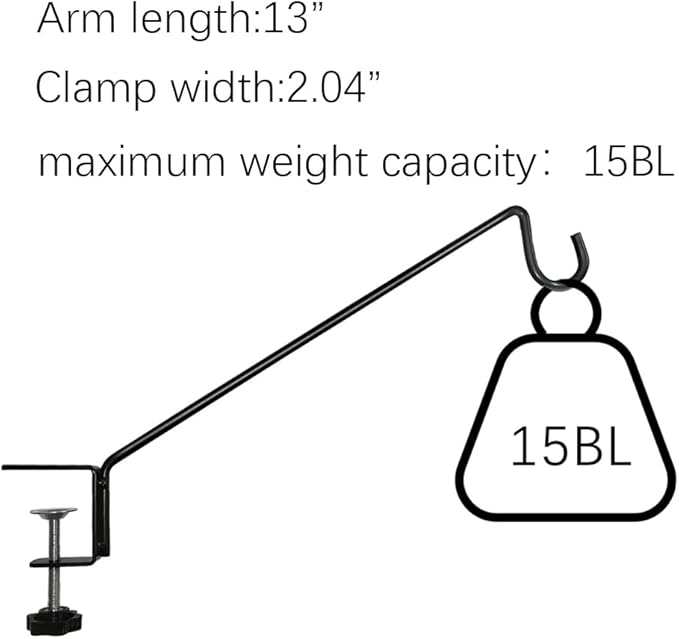 - 4 PACK 13 INCH DECK RAILS HOOKS-Our Deck Hook set includes 4 Clamp-On Deck Rail Hooks.The length of the arm is 13 inch, and the width of the clamp is 2.04 inch. Please carefully confirm the width of your deck and the length and diameter of the flowerpot/wind chime/garden lamp before purchasing