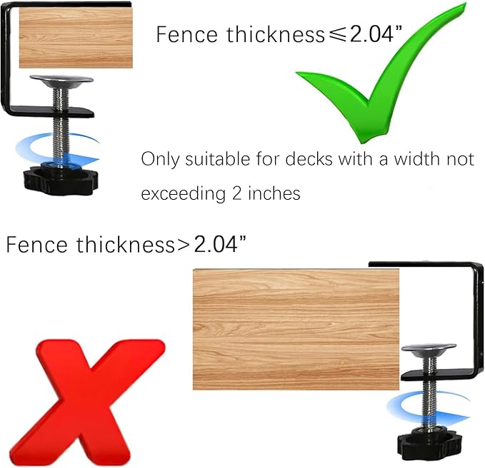 - STURDY AND HEAVY DUTY-Integrated desig make the deck hook more stronger and reliable.The reliable weather-proof powder-coated metal maintains its subtle black color and quality. Adjustable non-slip accommodates railings up to 2 inches thick. (Note: Only suitable for decks with a width not exceeding 2 inches )Suggested max hanging weight: 15 lbs.