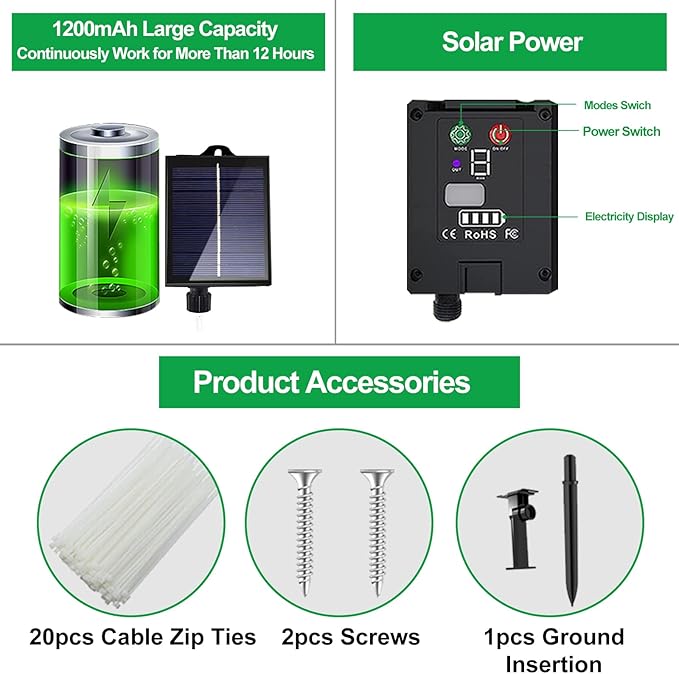 - 【High Battery Capacity & Safe】The solar string lights with 300pcs low-heat-emission LED bulbs, up to 19% high energy conversion rate comparing to others’ 13%. The solar fairy lights can work continuously for more than 12 hours at night if the panel absorbs enough sunshine during day. Meanwhile the fairy string lights is environmental friendly and energy efficient. The lights will not overheat after using many hours, so they are durable and safe to use.