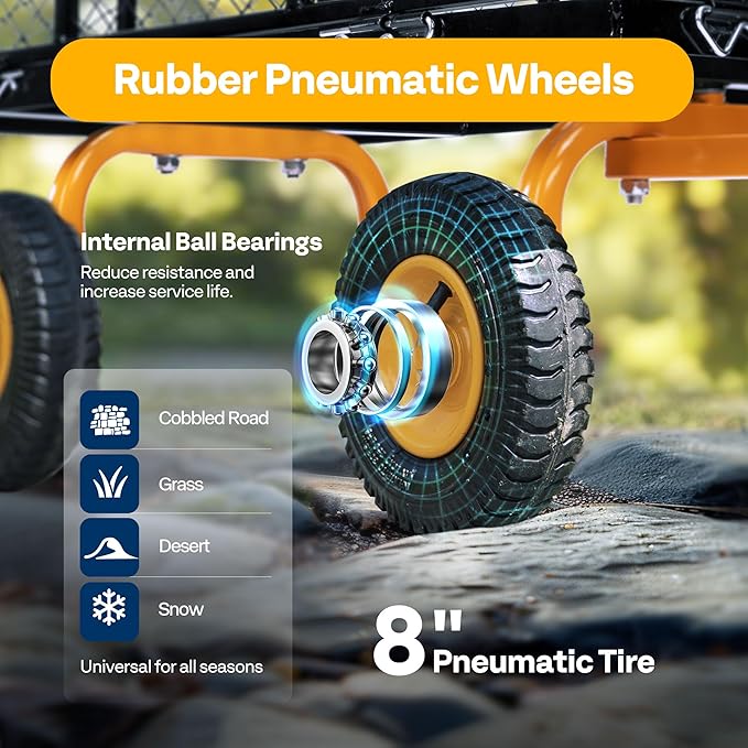 - IMPACT-PROOF TIRES - The load-bearing, shock-absorption, and noise-reduction of the cart are all determined by the casters; Compared with small wheels, four 8’’ pneumatic tires allow for easy maneuverability on rough terrain; The tread pattern of tires increases the friction with the ground; PLEASE BE AWARE that the tires should not be fully inflated due to safe transport consideration