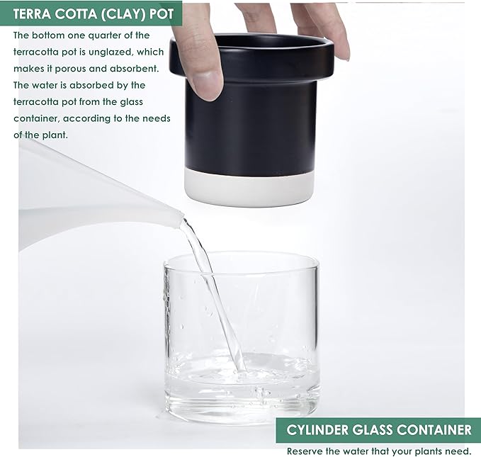 - Self-Watering System: The bottom quarter of the terracotta pot is unglazed, with a glass reservoir that allows plants to absorb just the right amount of water through the pot walls.
