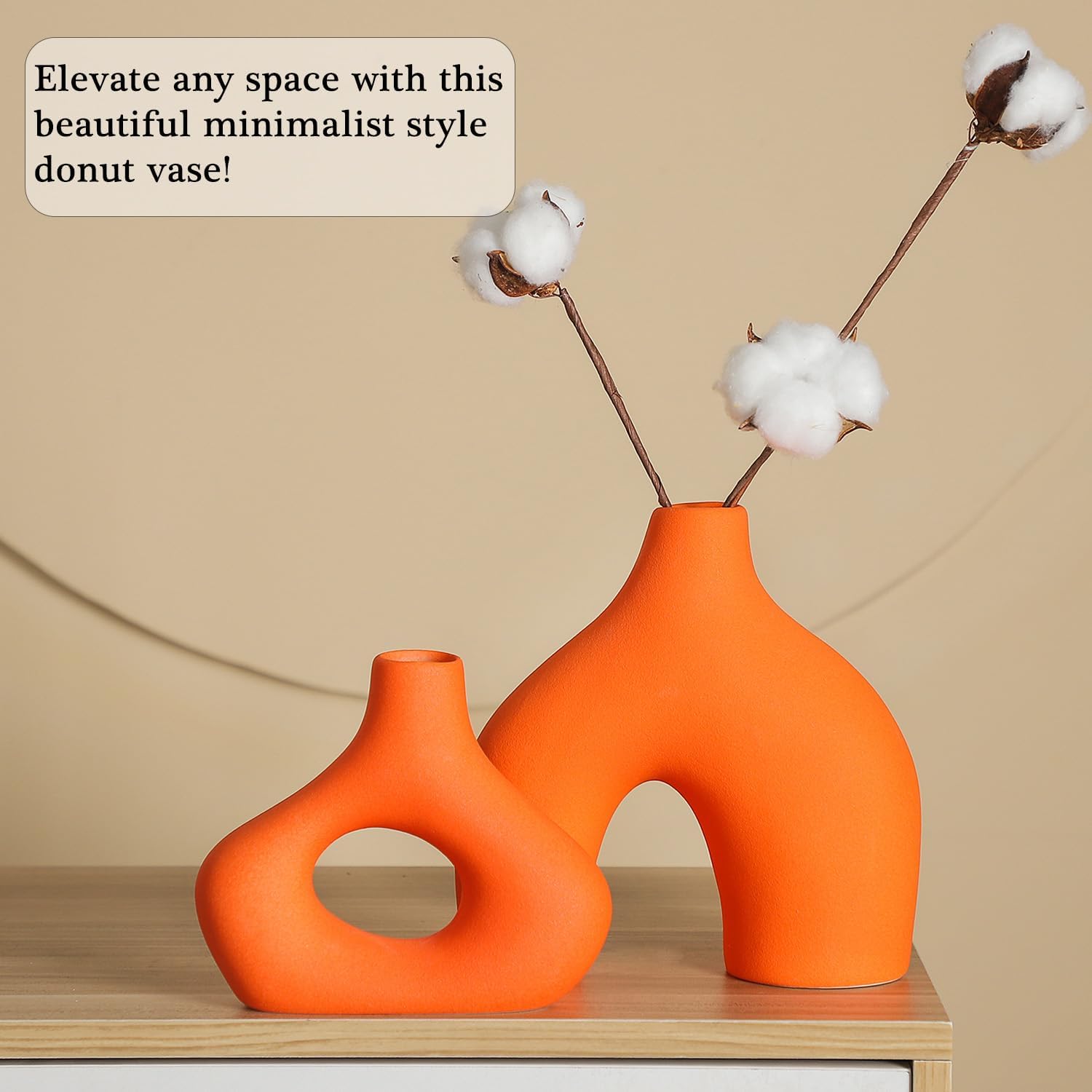 CEMABT Orange Ceramic Vase Set of 2 for Modern Minimalist Bohemian Decor,Round Matte Donut Vases for Pampas Grass-Perfect for Living Room, Dining Table, Office Bedroom Shelf Decor Entryway, Console