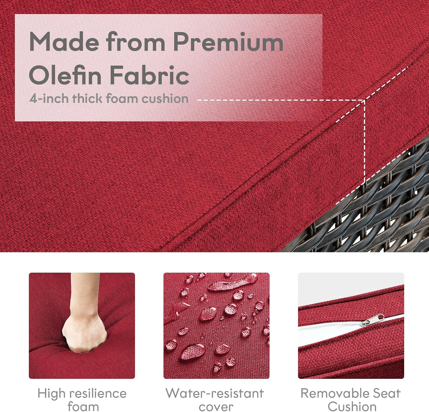 - 4.Comfortable And Easy To Clean: Both chairs in this outdoor patio set are equipped with 4-inch thick foam seat cushion and 8-inch thick cotton back cushion, which is ergonomic and improves the overall comfort of the wicker chair. The patio chair cushion covers are made of outdoor specialty olefin fabric that is water resistant, and each cushion is equipped with zippers that are removable and easy to clean.