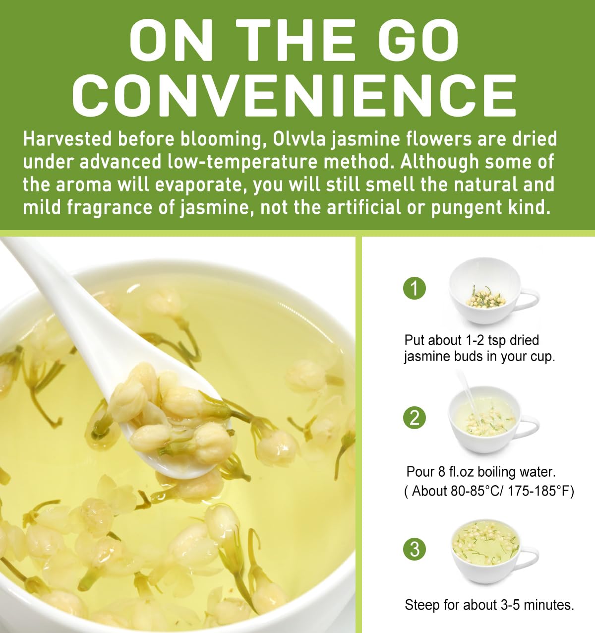 - EASY TO USE: The food grade dried jasmine buds are placed in a resealable bag to keep them fresh and fragrant. Just put about 1-2 tsp jasmine buds in your cup, add 8 fl.oz of boiling water. Steep for about 3-5 minutes. Enjoy it;