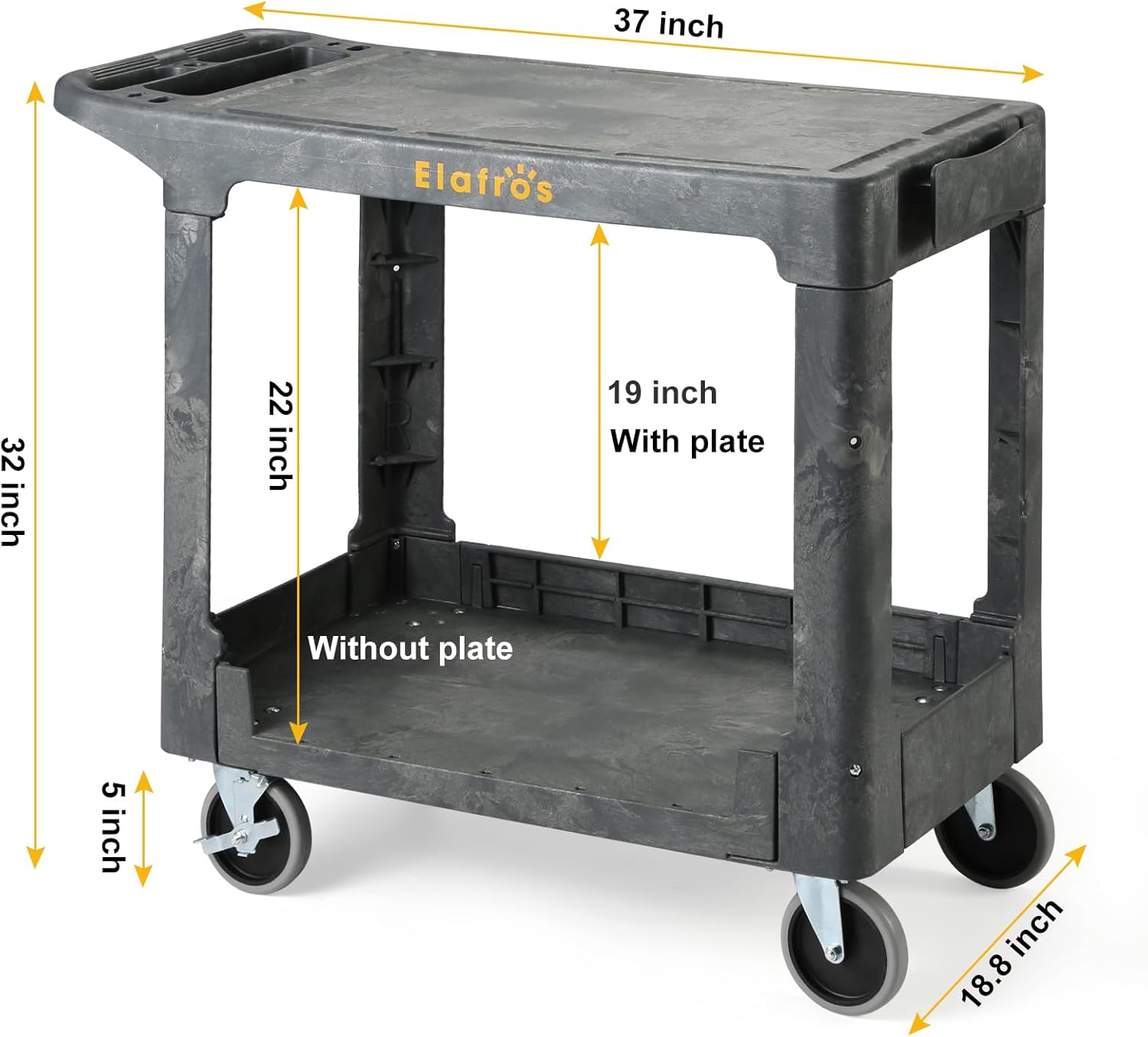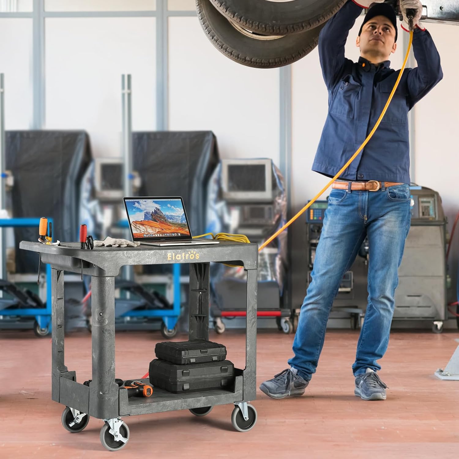 ELAFROS Heavy Duty Plastic Utility Cart Flat top 37 x 18.8 Inch - Work Cart Flat Shelves and Full Swivel Wheels Safely Holds up to 550 lbs - 2 Tier Service Cart for Warehouse,Garage, Cleaning Gray