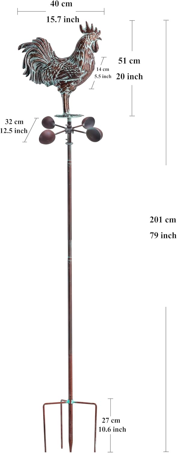 - Metal Chicken Rooster Wind Spinner for Yard and Garden - The rooster sculpture garden stake measures 79" H x 15.7" L x 12.5" W. This vintage-style vintage metal chicken decoration not only enhances your gardening decor but also serves as a conversation starter, making it a unique addition to outdoor. Perfect decorative accent piece to enhance rustic, country, or farmhouse style outdoor interiors