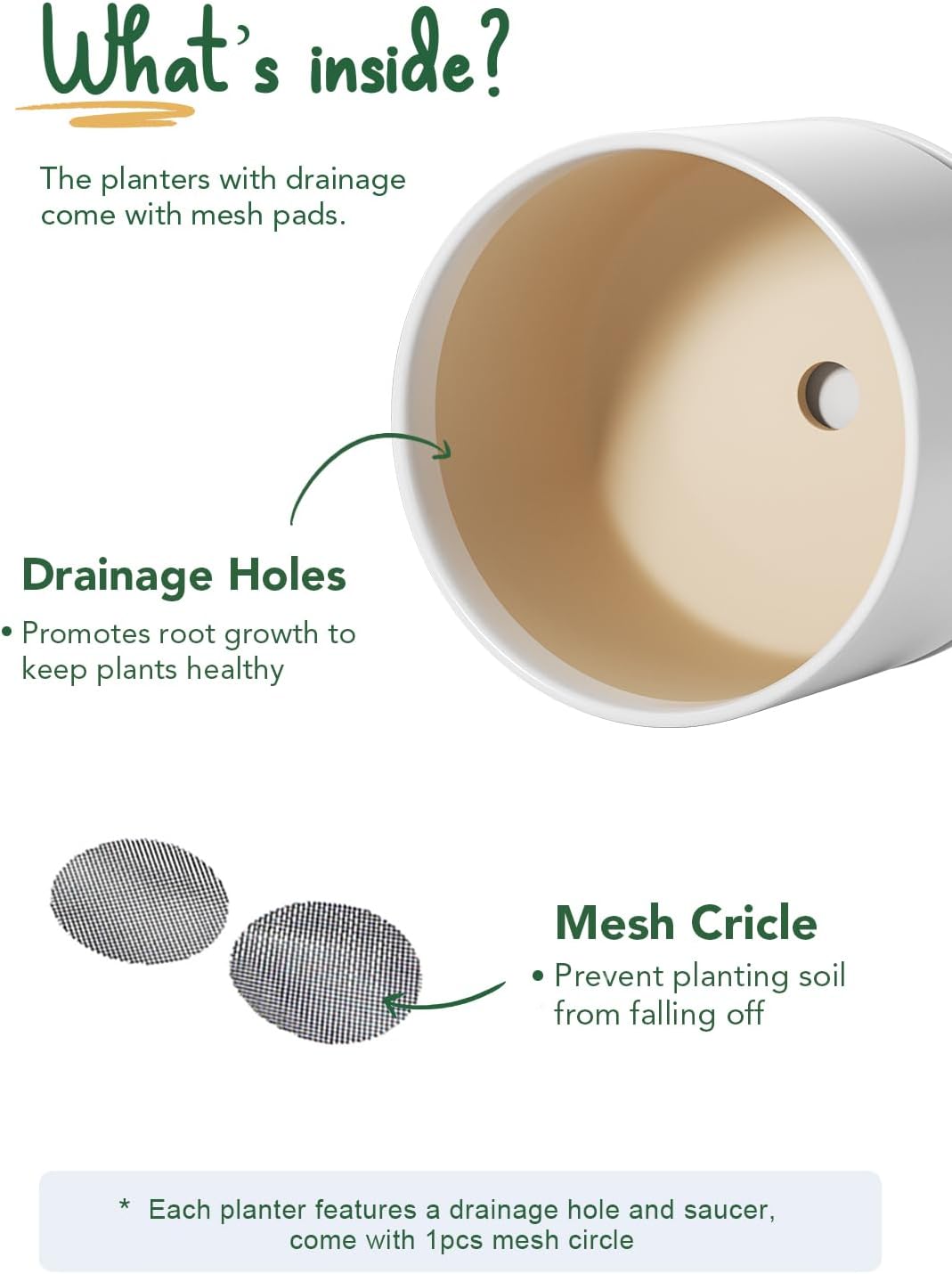 - Integrated Drainage System: Each plant pot features an integrated drainage hole, plus a mesh drainage net and silicone pad, and sits on a matching saucer to prevent overwatering and keep surfaces spotless—helps promote healthy root growth for all your pots for indoor plants