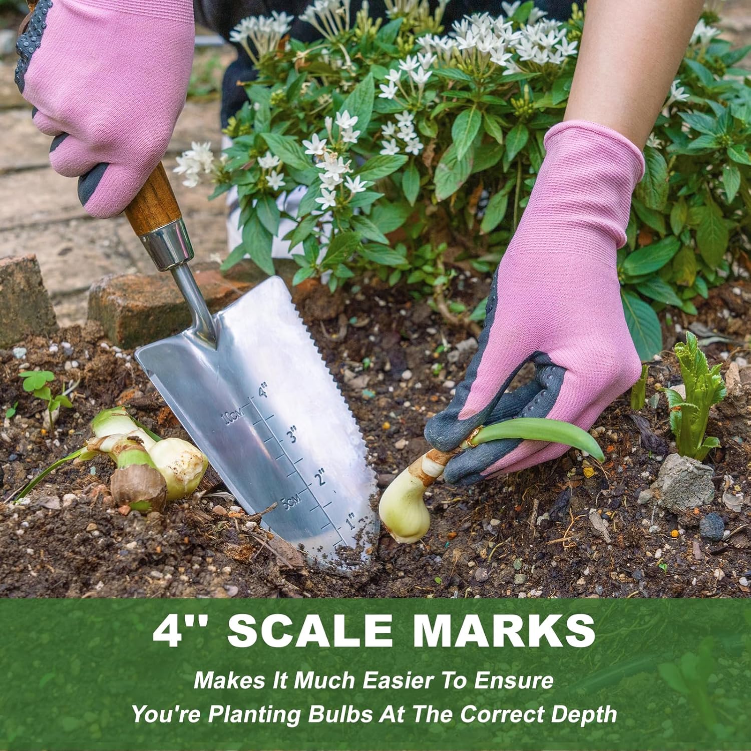 - 【Measuring Scale】The English scale with 1 to 4-inch depth marks on the side of the gardening shovels helps to maintain a consistent depth. No other tools or measuring devices were needed to make all your bulbs and young seedlings planted at the right depths.