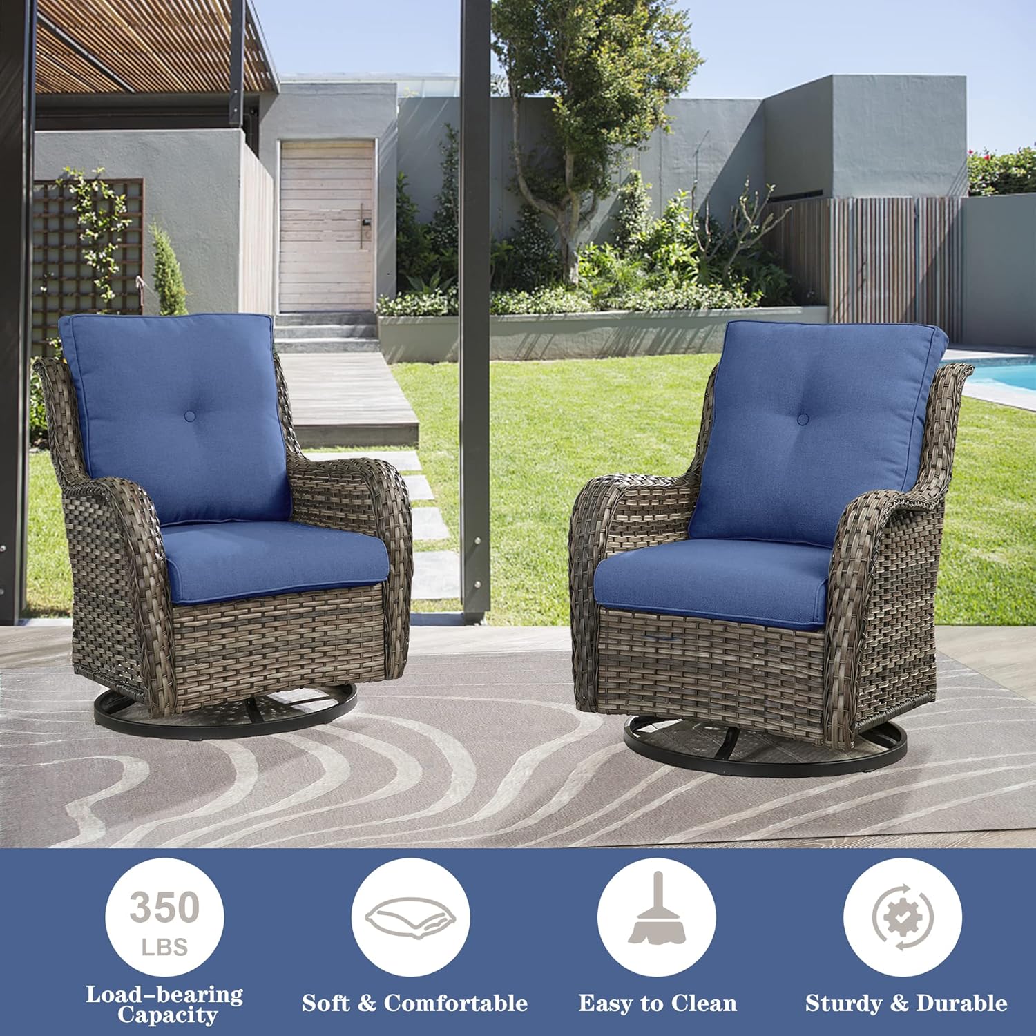 - 2.Serene Wicker Swivel Elegance: Soothe away stress in our unique wicker swivel rocker glider chairs that combine the relaxing benefits of glider with the soothing motion of 360 swivel. Designed for pure relaxation, these outdoor swivel rocker chairs elevate your outdoor comfort, adding a touch of luxury to your space.