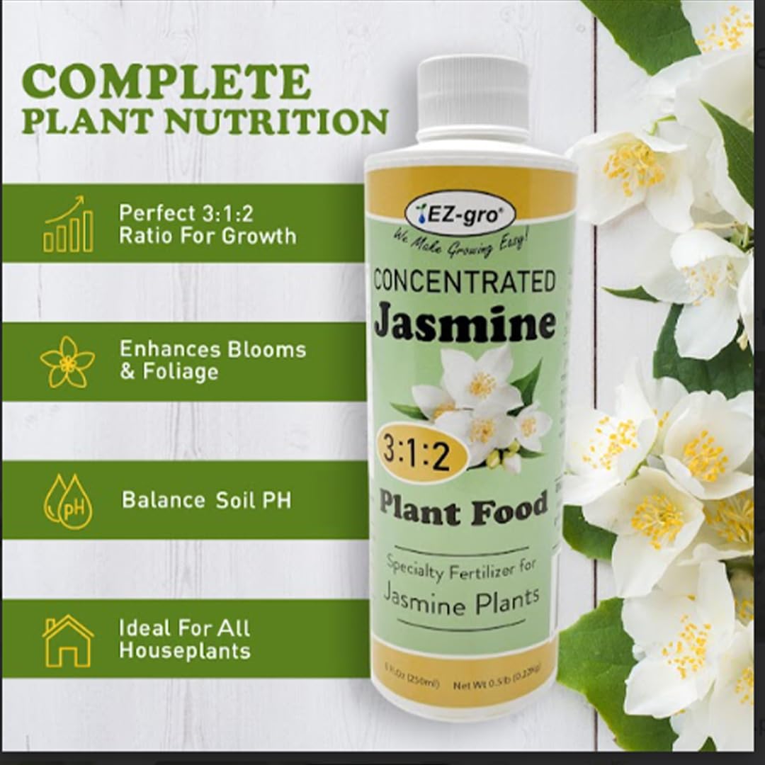 - Enhanced Growth: EZ-gro Liquid Jasmine Plant Fertilizer is a concentrated indoor plant fertilizer with a 3:1:2 nutrient ratio, perfect for Jasmine plants. This 8 oz bottle delivers the nutrients Jasmine and other tropical indoor plants need to thrive. Made in the USA for quality you can trust.