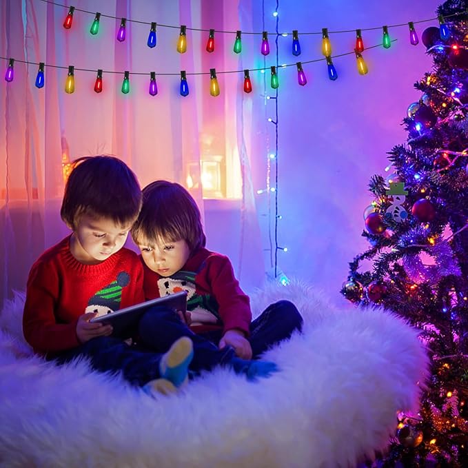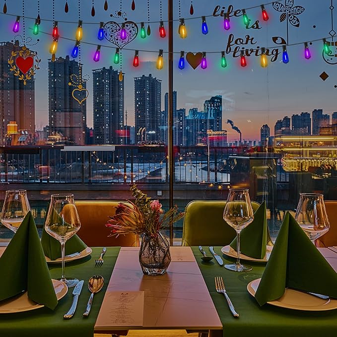 - Shatterproof and Waterproof Colored String Lights: Colored Edison string lights use plastic shatterproof bulbs to protect you from the safety hazards of broken glass. The hanging outdoor lights are UL certified for both indoor and outdoor use, and the bistro string lights are weatherproof and can withstand the extreme temperatures of snow, sun, humidity, wind, rain and outdoor use.