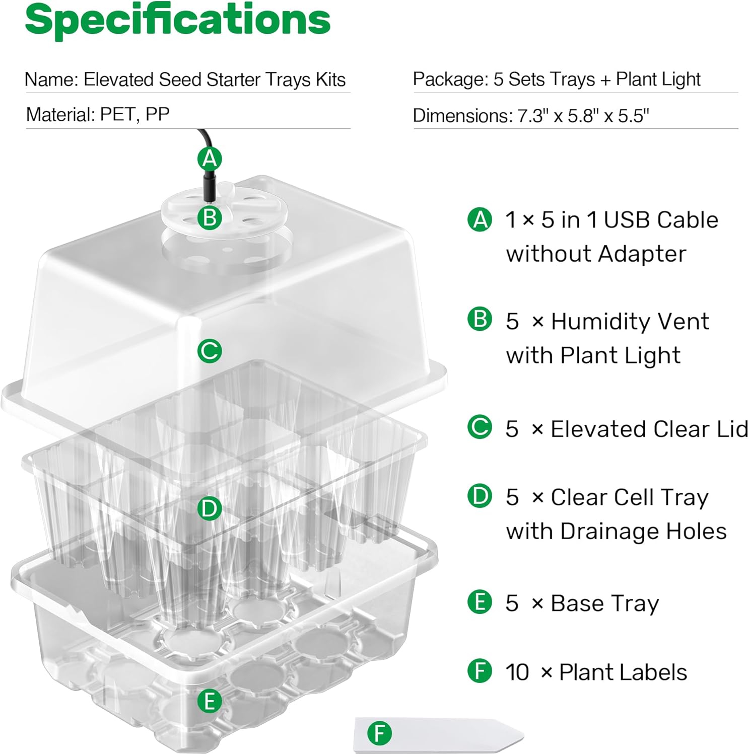 Bonviee 5 Packs Seed Starter Tray with Grow Light, Elevated Seedling Starter Trays Kits with Adjustable Humidity Domes and Clear Cell Tray, 12 Full Spectrum led lamp Beads for Plants Indoor-Clear