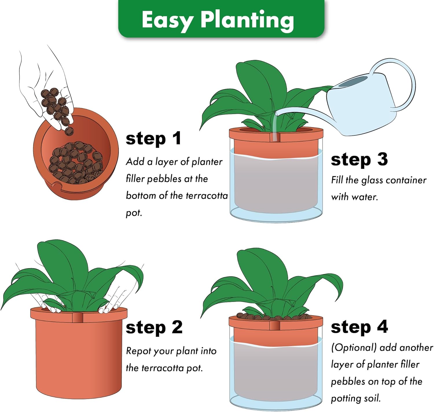 - Self-watering System: The bottom section of the white terracotta pot is unglazed, just fill the glass container with water to ensure plants will absorb only what they need through the terracotta pot walls.