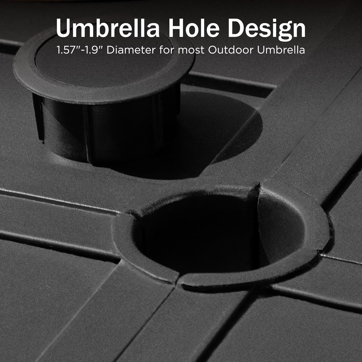 - Adjustable Umbrella Hole: The adjustable umbrella hole is 1.59”-1.9”, You can resize the hole by changing the cap. And the underside of our table is equipped with a sturdy metal ring to lock the umbrella pole in place. The umbrella holes fit most sizes of umbrellas on the market.