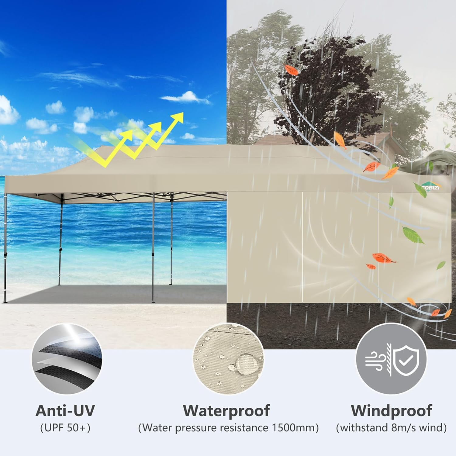 COBIZI 10x30 Heavy Duty Pop up Canopy with 8 sidewalls Stable Wedding Outdoor Tents for Parties Canopy Pop Up Party Tent UPF 50+ Waterproof Commercial Gazebo with Roller Bag, Khaki(Windproof Upgraded)