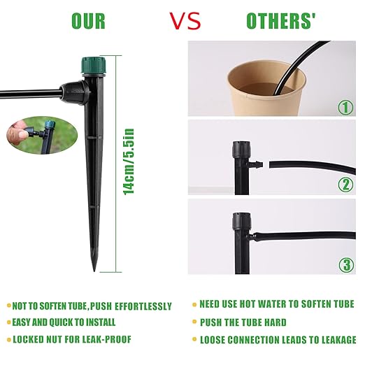 - 【Measurement】Emitters and tees:works perfectly with 1/4 inch drip irrigation tubing, ideal for 4mm(inner)-7mm(outer) garden watering system;Irrigation dripper stake height: 5.5 inch.Please pay attention to the specifications before purchasing