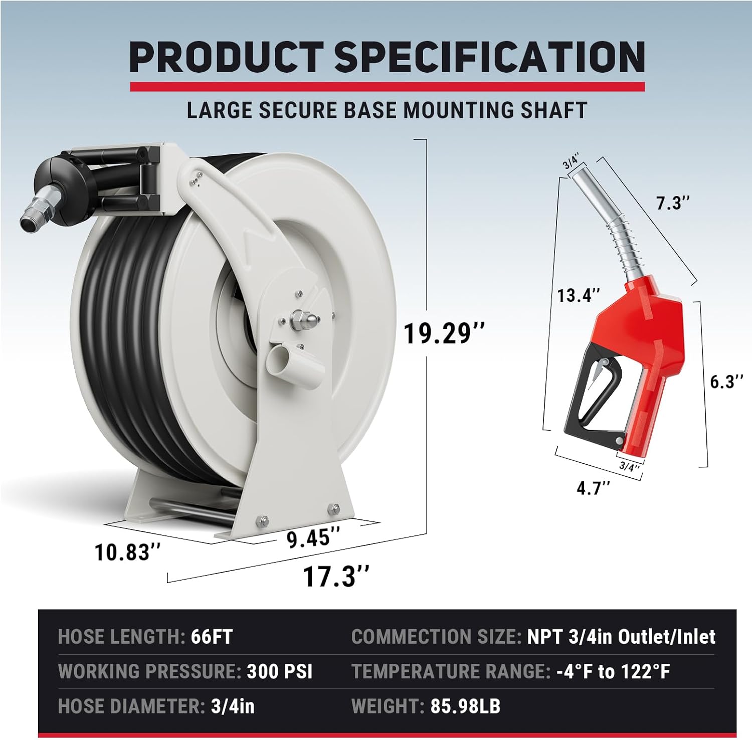 Retractable Fuel Hose Reel, 3/4 in × 66 ft Rubber Hose Heavy Duty Steel Professional Spring Driven Diesel Hose Reel with Fueling Nozzle Max 300PSI Auto Rewind Quick for Ship Vehicle Tank Truck