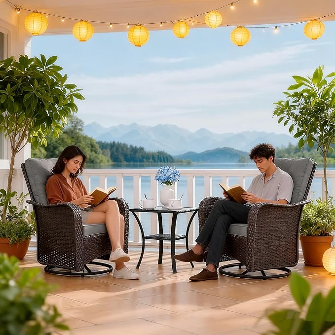 - User-Friendly Design: This Gotland patio bistro set offers versatile motion. The patio rocking chair smoothly glide 360° and rock gently. Cushions stay secure with hook-and-loop fasteners, and the two-tier coffee table provides ample storage, combining function with style.