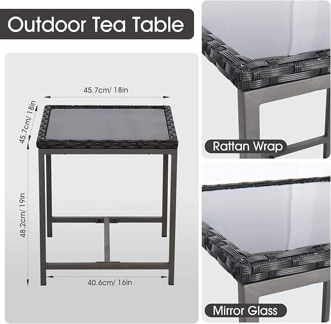 - Water-resistant fabric: The fabric used in our chairs is water-resistant, providing added durability and protection against spills. No need to worry about sudden downpours or accidental spills ruining your outdoor experience.The toughened glass coffee table adds a touch of class to your outdoor space, making it a perfect spot for leisurely tea sessions or cocktail hours.