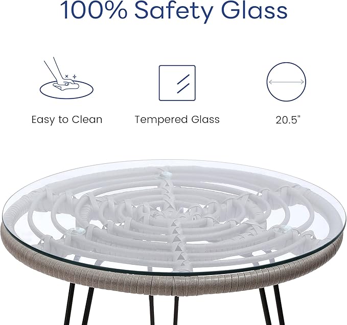 - 【WHATS INCLUDED】Each 3 piece bistro conversation set includes 2 overstuffed waterproof zippered cushions, 1 cocktail table with a tempered glass top, and 2 boho style indoor outdoor chairs.