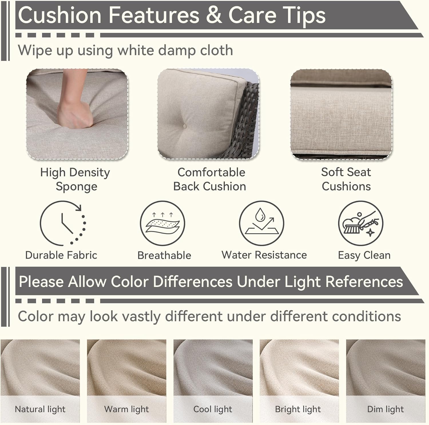 - [Easy-Clean Cushions] Wipe with a white damp cloth for easy clean. Allow for color differences in different ambient light and displays