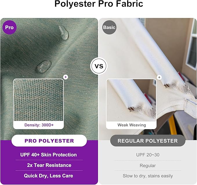 - Premium Polyester Pro Canopy: Features 2X tear-resistant fabric with 3 years fade resistance, quick-drying and easy to clean. Withstands sun, rain and wind while resisting wrinkles and shrinkage for lasting durability.