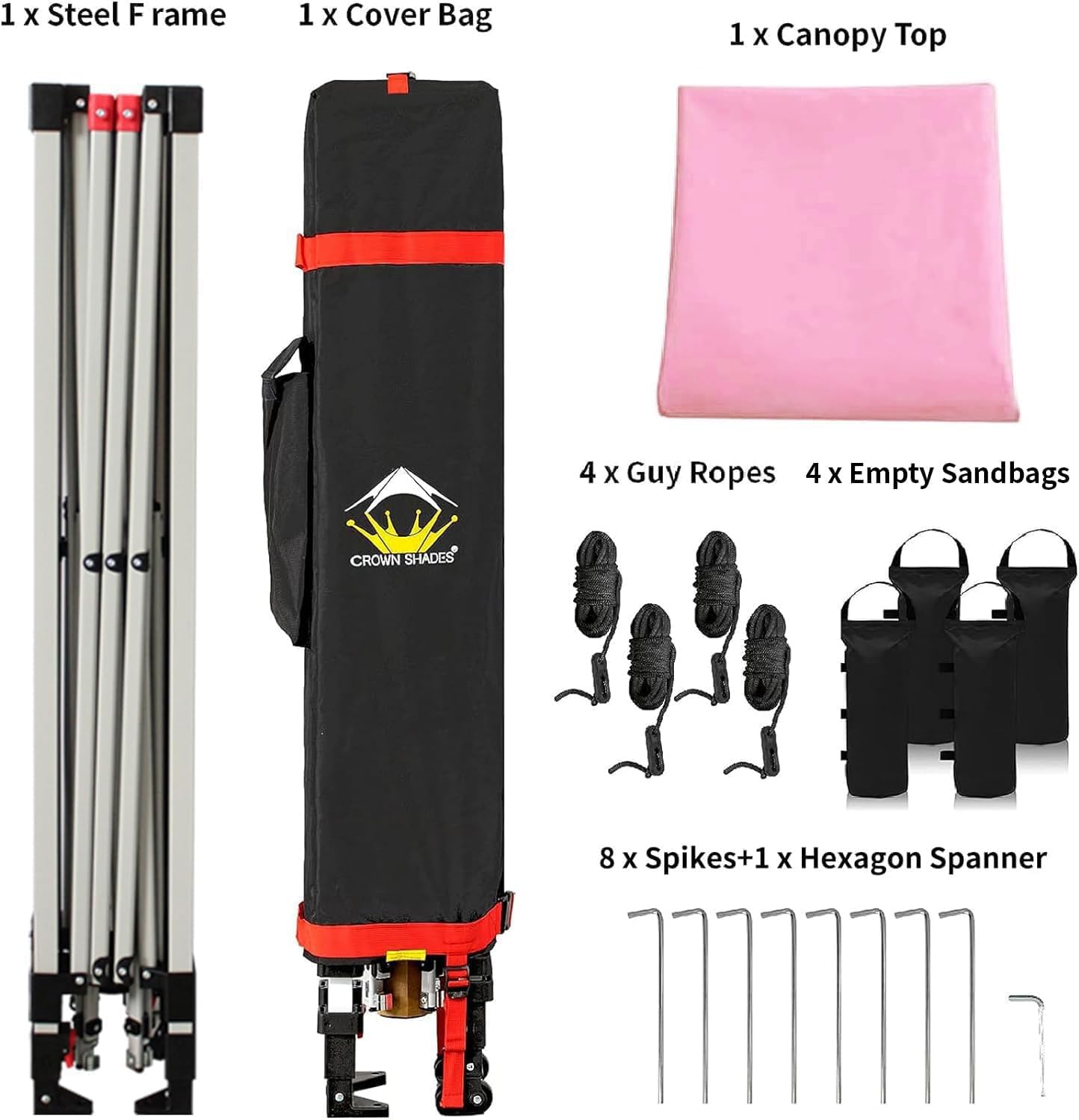 CROWN SHADES 10x10 Pop Up Canopy - Beach Tent with One Push Setup - Easy Outdoor Sun Shade for Events, Parties, Camping - Gazebo with STO-N-Go Cover Bag, Silver Coated Top, Pink