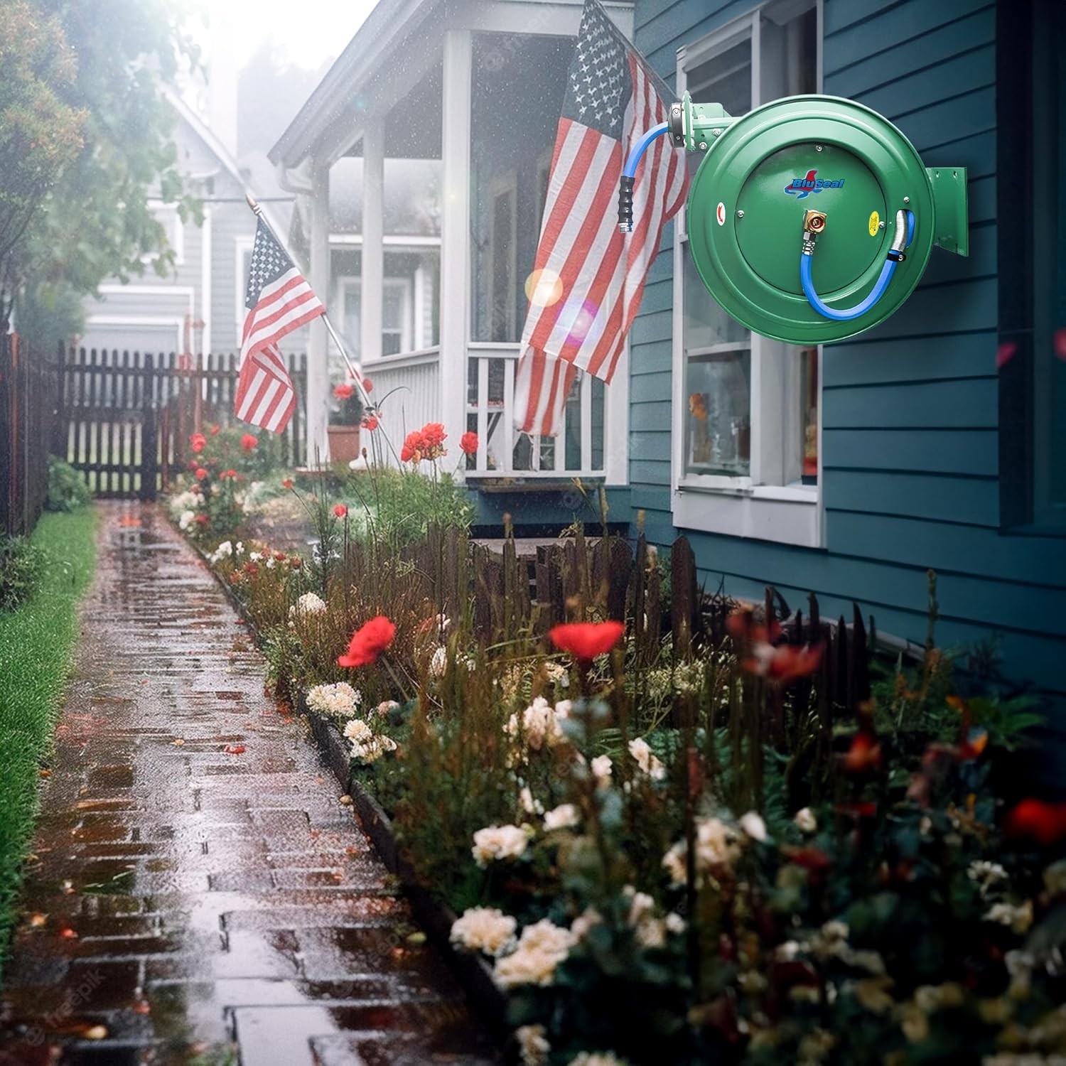 - NEVER COIL YOUR WATER HOSE AGAIN: keep your garden beautiful and gardening fun with this spring based retractable garden hose reel, made for home and institutional use but constructed with industrial quality powder coated steel parts, saves time, keeps your garden clean, avoids tripping hazards, looks great, just makes sense
