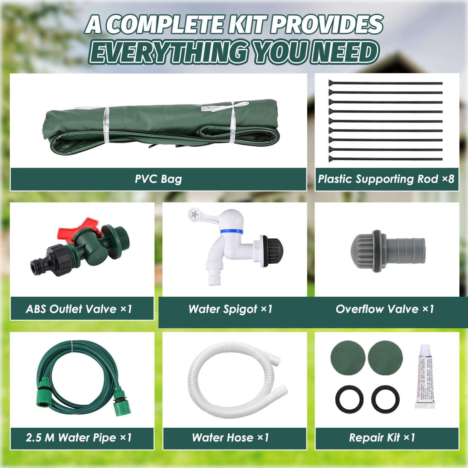 - Easy To Assemble The kit offers all accessories you need: plastic supporting rod *8, outlet valve *1, water spigot *1, overflow valve *1, 2.5 m water pipe *1, water hose *1, and repair kit *1. The outlet valve can be connected to 3/4 inch water pipes. The installation is comprehensible and can be completed within minutes by following the instructions.