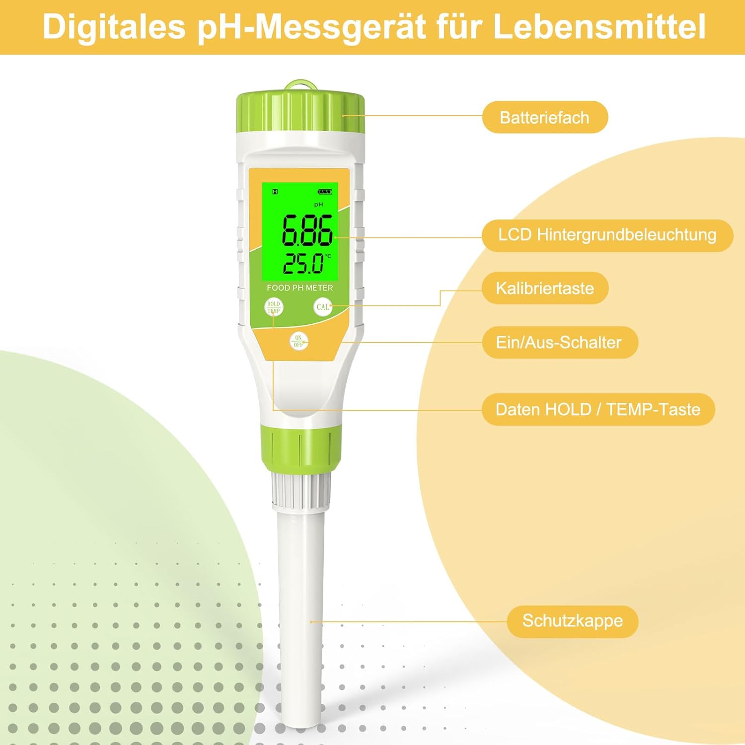 - Food pH Meter - The food pH tester is designed for highly accurate pH testing of soft solid samples, simply insert the spear probe into the sample and wait for the value to stabilize for an accurate measurement, suitable for a wide range of items such as cheeses, sushi rice, meats, fruits, doughs, jams, sauces, skincare products and solid media.