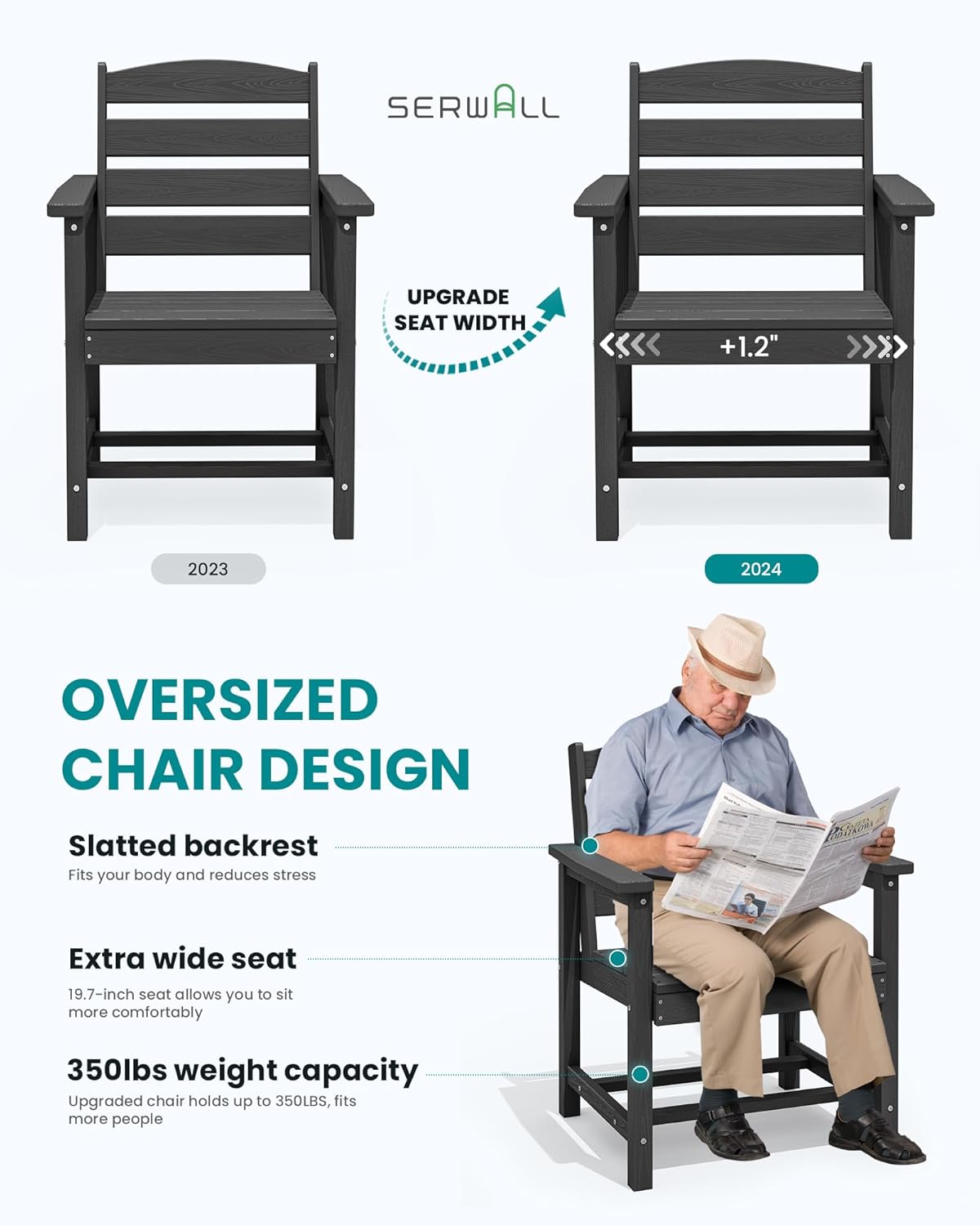 - 【All Weather Use】SERWALL patio dining chairs are built to withstand the elements and provide long-lasting performance. The sturdy frames and high-density polyethylene materials ensure durability and reliability, allowing you to enjoy outdoor dining for years to come.