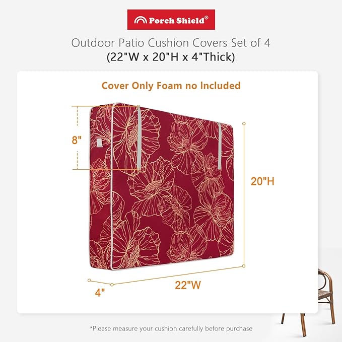 - Dimensions: The cover for outdoor cushion measures 22"L x 20"W x 4"Thick, fits most deep seat cushions, dining chair cushions, club chair cushions and sofas with individual cushions. One-year limited warranty, covers only, insert not included.