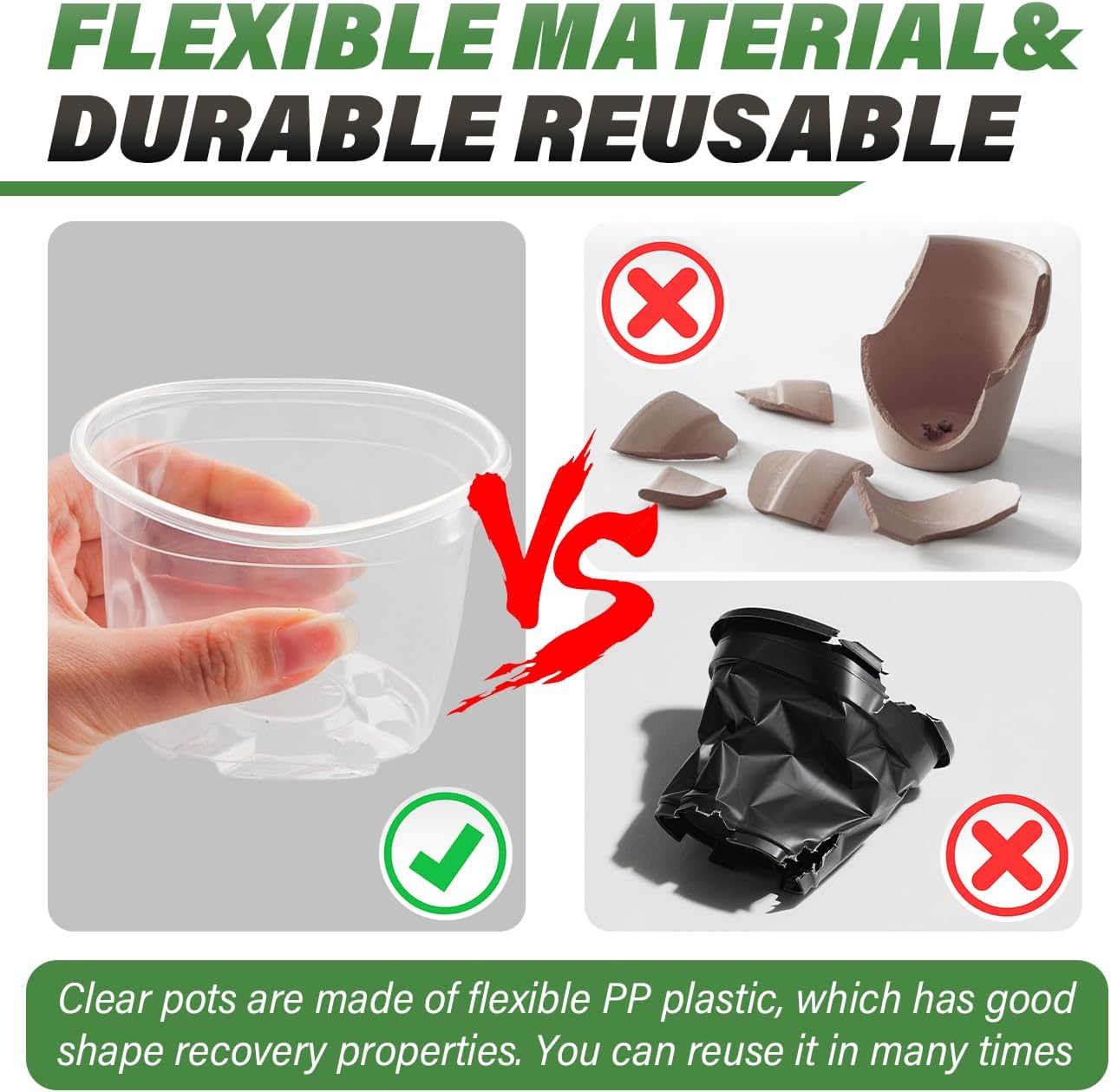 - 【Clear Plastic】Clear transparent plastic pots to watch the seeds germination, roots starting growing every day. Made of fresh new plastic PE, no ordor or harm for plants growing, BPA free.
