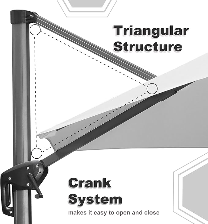 - The crank system of this cantilever umbrella makes it easy to raise and lower the canopy, the unique handle design also makes tilting the umbrella effortless, foot pedal allows for complete 360 degree rotation