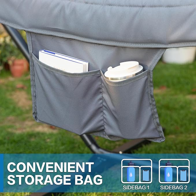 - ULTRA-COMFORTABLE DOUBLE PILLOW & CONVENIENT SIDEBAG: Sidebags on the side of the hammock provide convenient storage for your phone, water bottle, books and more! The tight mesh cotton rope weave promotes air flow and helps relieve physical fatigue