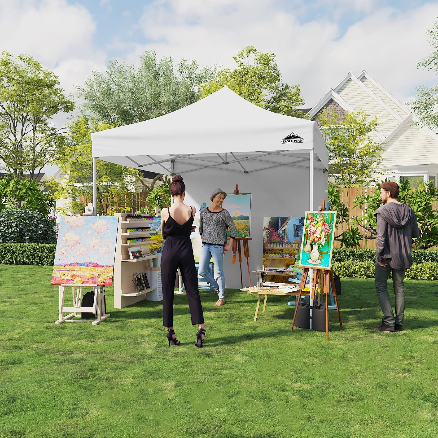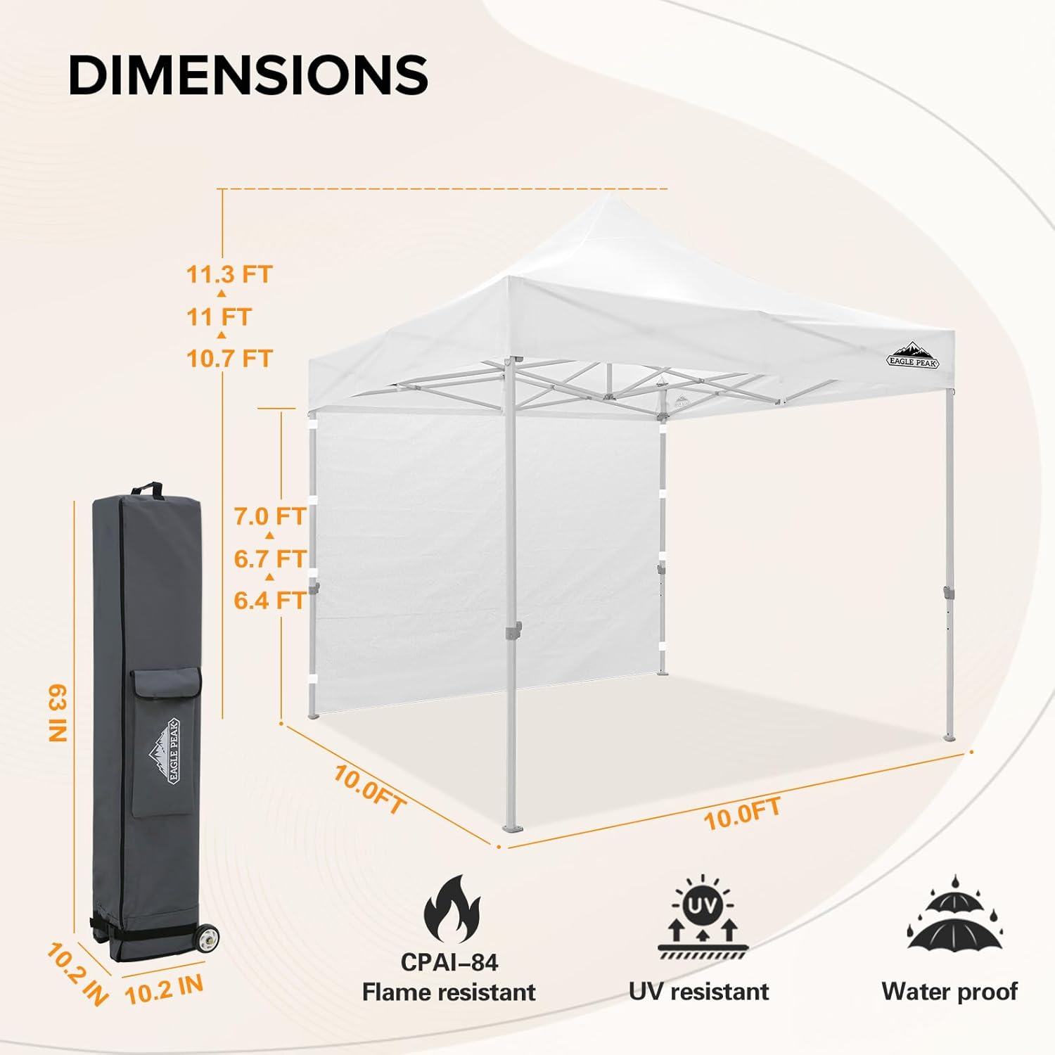 EAGLE PEAK 10x10 Heavy Duty Pop up Commercial Canopy Tent with One Removable Sidewall, Instant Sun Shelter with Roller Bag, 4 Sandbags, White