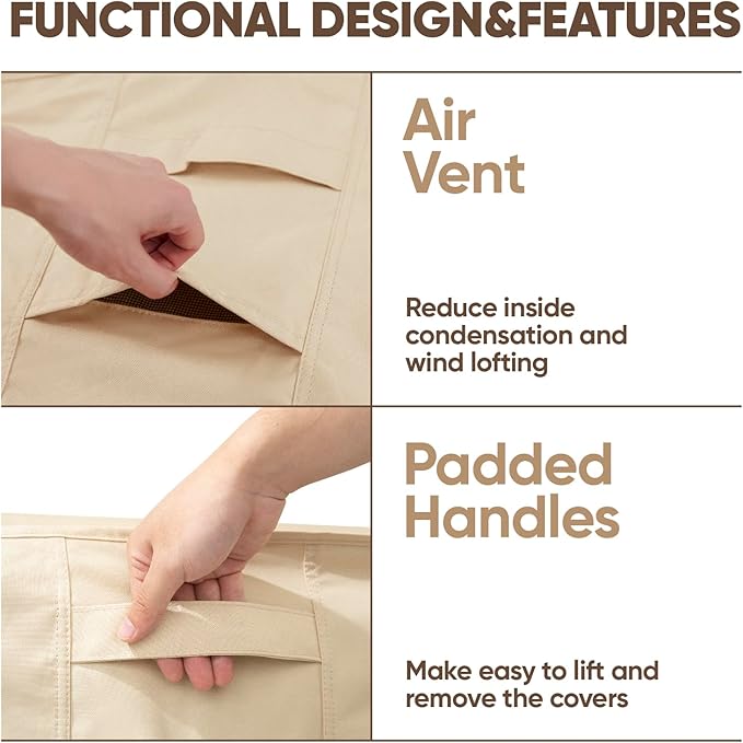 - Sun-Resistant and Long Lasting - With an advanced PVC waterproof coating, our outdoor patio furniture covers can withstand prolonged exposure to the sun without fading. It ensures that your outdoor furniture remains in top condition, safeguarding it from wind, rain, and the harsh effects of sunlight.