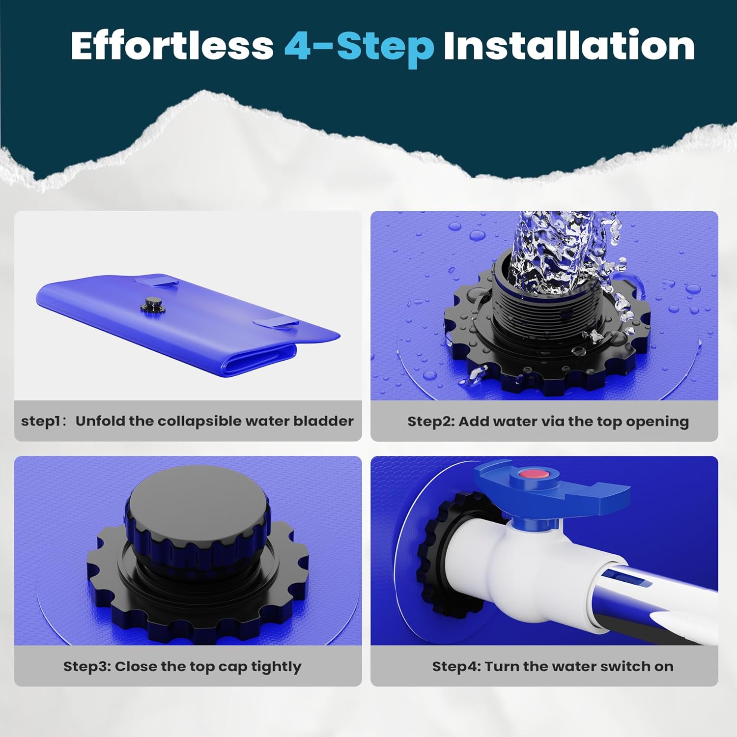 - đ§ăHigh-quality MaterialăPortable water tank is made of double-sided high-density coated PVC material with tough mesh, water bladder sealing against leakage, high-frequency welded sealing structure, and reinforced ribs sealing around the ports.