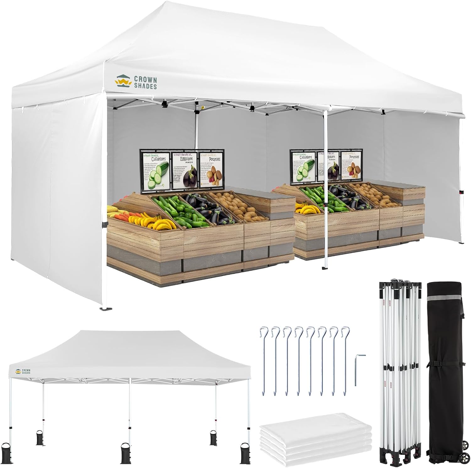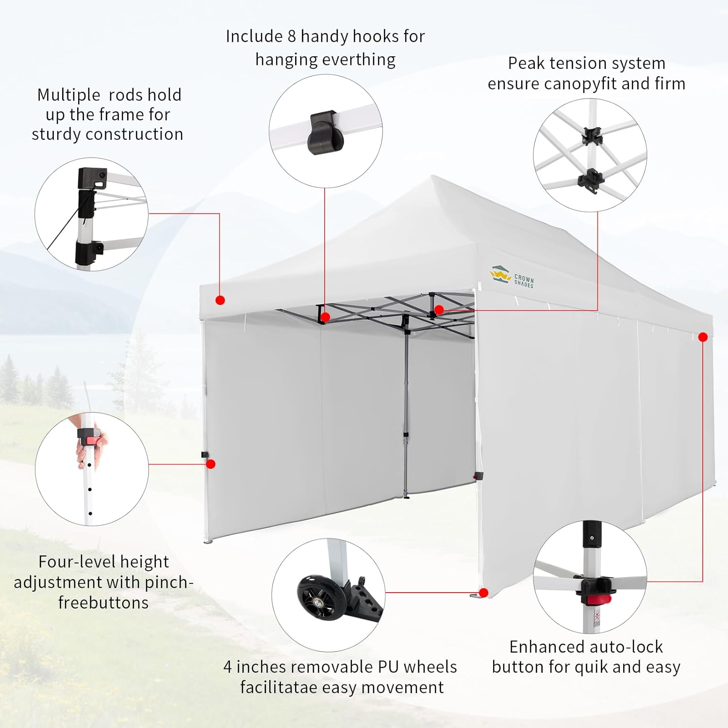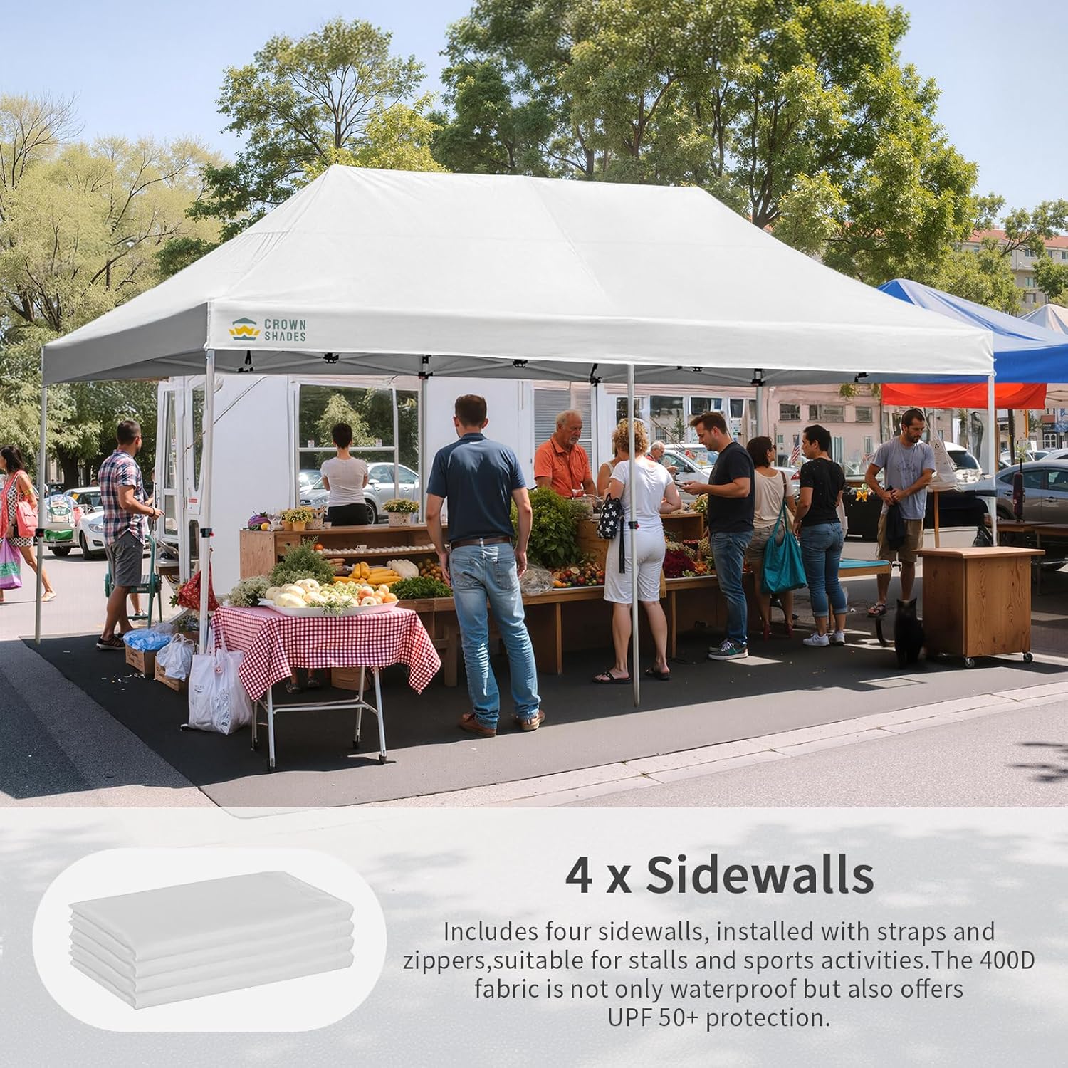 CROWN SHADES 10x20 Pop Up Canopy Tent, Thicken Frame Commercial Heavy Duty Tent, 4 Sidewalls 8 Stakes & 4 Sandbags & 4 Ropes, Outdoor Canopies for Events, Parties,White