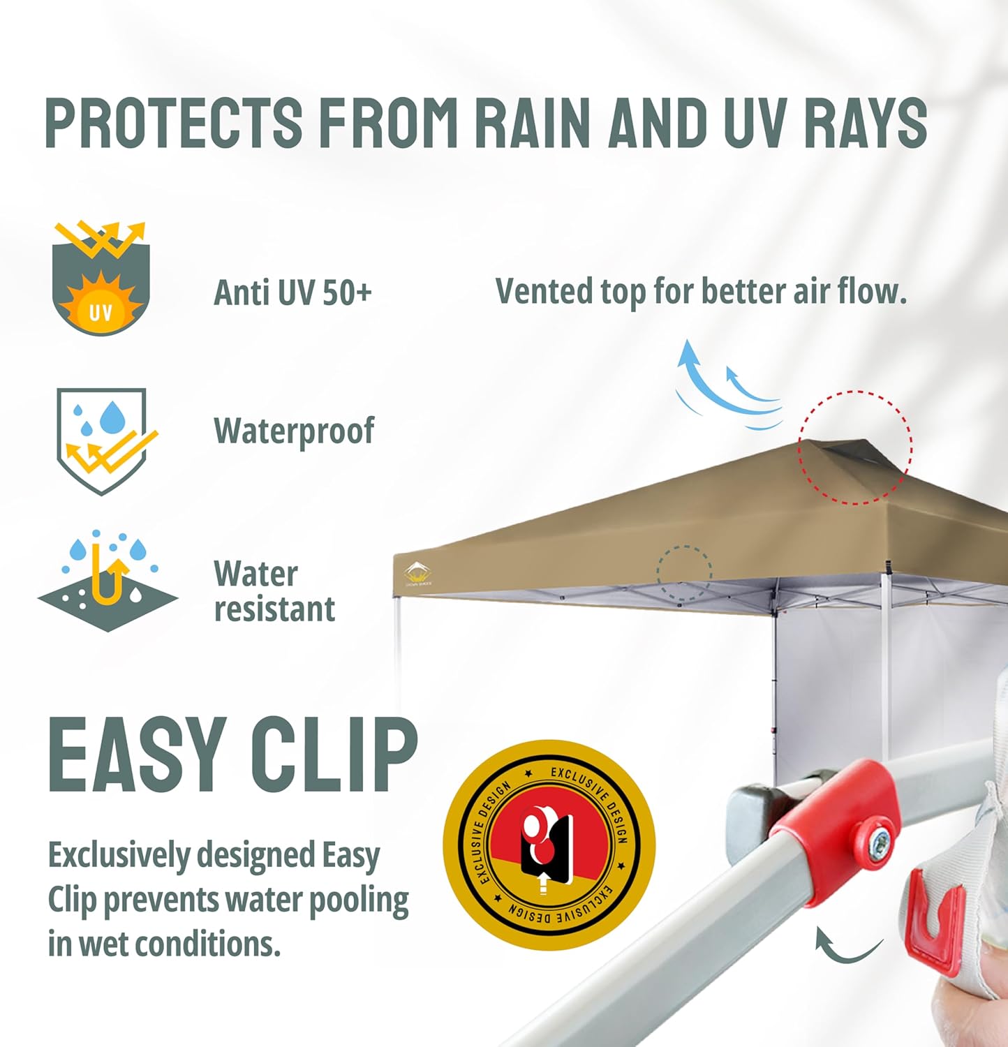 - EZ CLIP CANOPY FABRIC - The newly designed clip system makes it easy to attach the canopy fabric to the frame. The silver-coated interior provides exceptional UPF 50+ UV protection, ensuring cooler, safer shade. Made from rugged 150D fabric, the canopy is water-resistant and CPAI-84-rated for flame resistance. The canopy features integrated air vents, and the EZ clip system prevents wind lift and rain pooling, reducing fabric tearing risks. Ideal for outdoor events, weddings, and gatherings.
