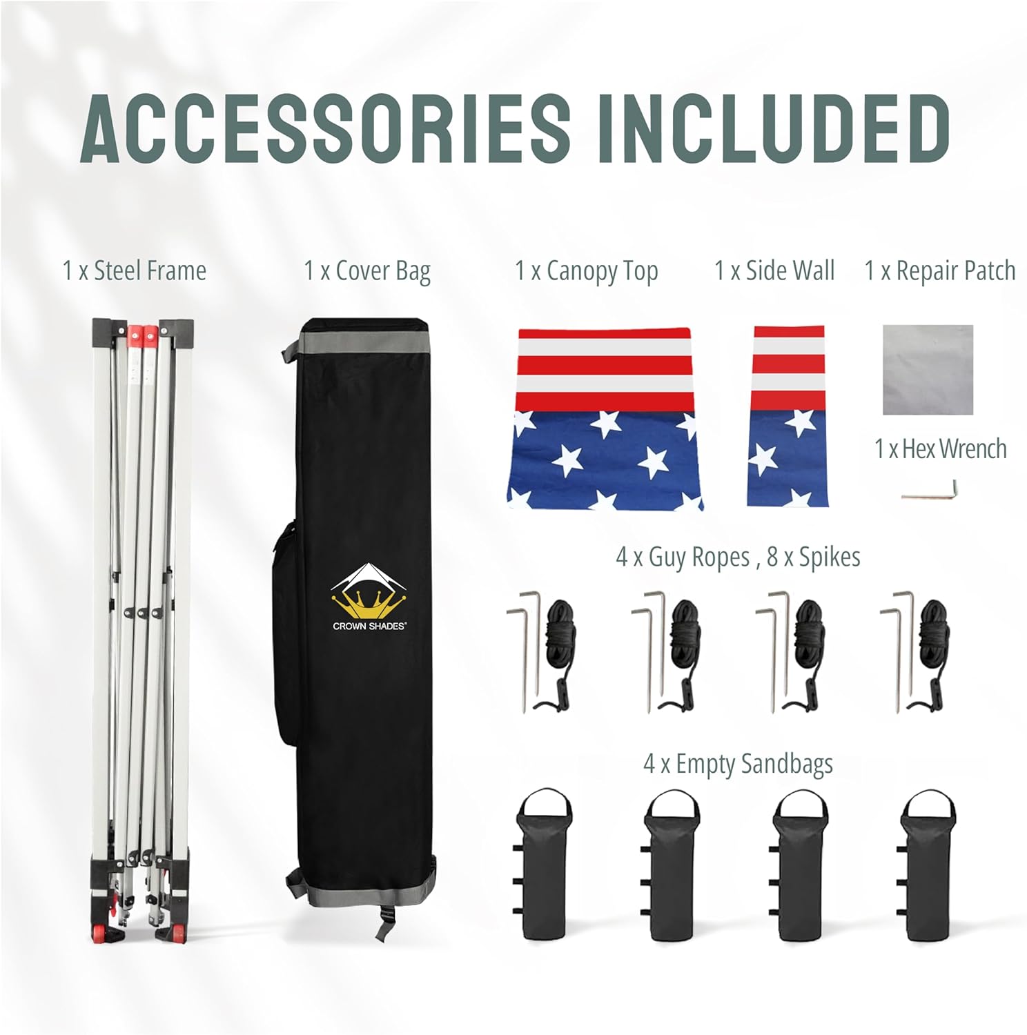 CROWN SHADES 10x10 Pop Up Canopy with 1 Side Wall - Beach Tent with One Push Setup - Outdoor Sun Shade for Events, Parties, Camping - Gazebo with STO-N-Go Cover Bag (American Flag)