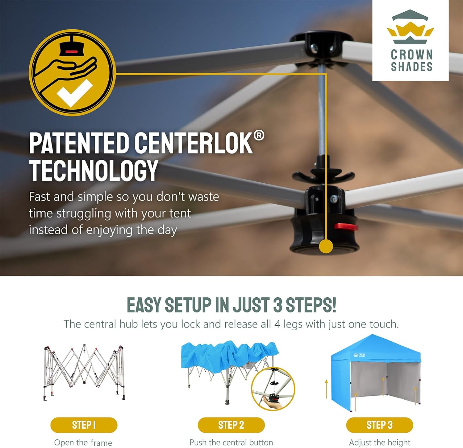 - [EASIEST SET UP]: The patented central lock technology allows you to lock all four legs with a single push at the center hub. The leg height can then be adjusted using soft, pinch-free buttons. The next-generation canopy has been designed for ease of use, allowing two people to set it up in a matter of seconds without the need for any tools.