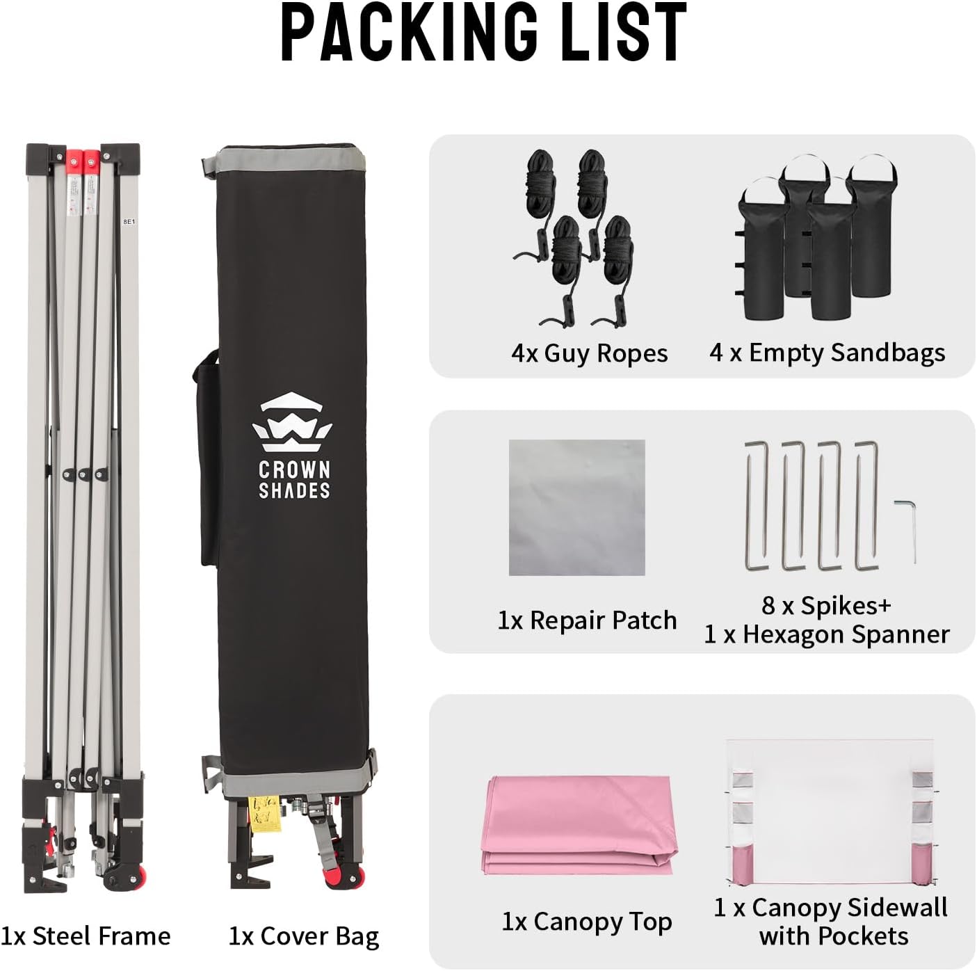 CROWN SHADES Canopy Tent, 10 x 10 Foot Portable Pop Up Outdoor Shelter with Pocket Sidewall, Push Center Lock, UV Protection, and Carry Bag, Pink