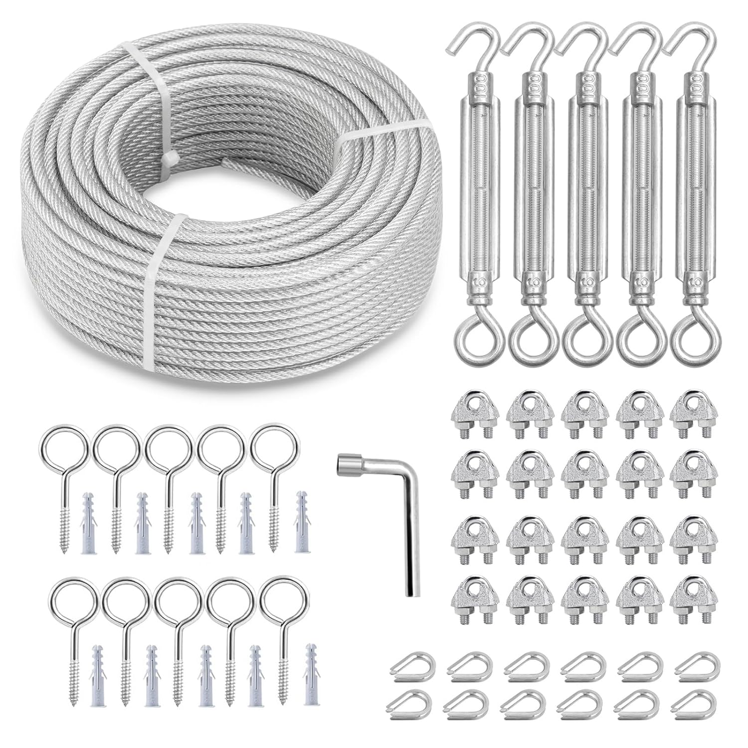 - 3/16" Cable Railing Kit: Package includes wire rope + complete accessories, which are a 100 ft steel cable, 5× M6 turnbuckle hooks and 10× eye screws, 20× U bolt saddle fastener, 12× steel cable thimbles, 10× expansion pipes, and 1 cable clamp screwdriver